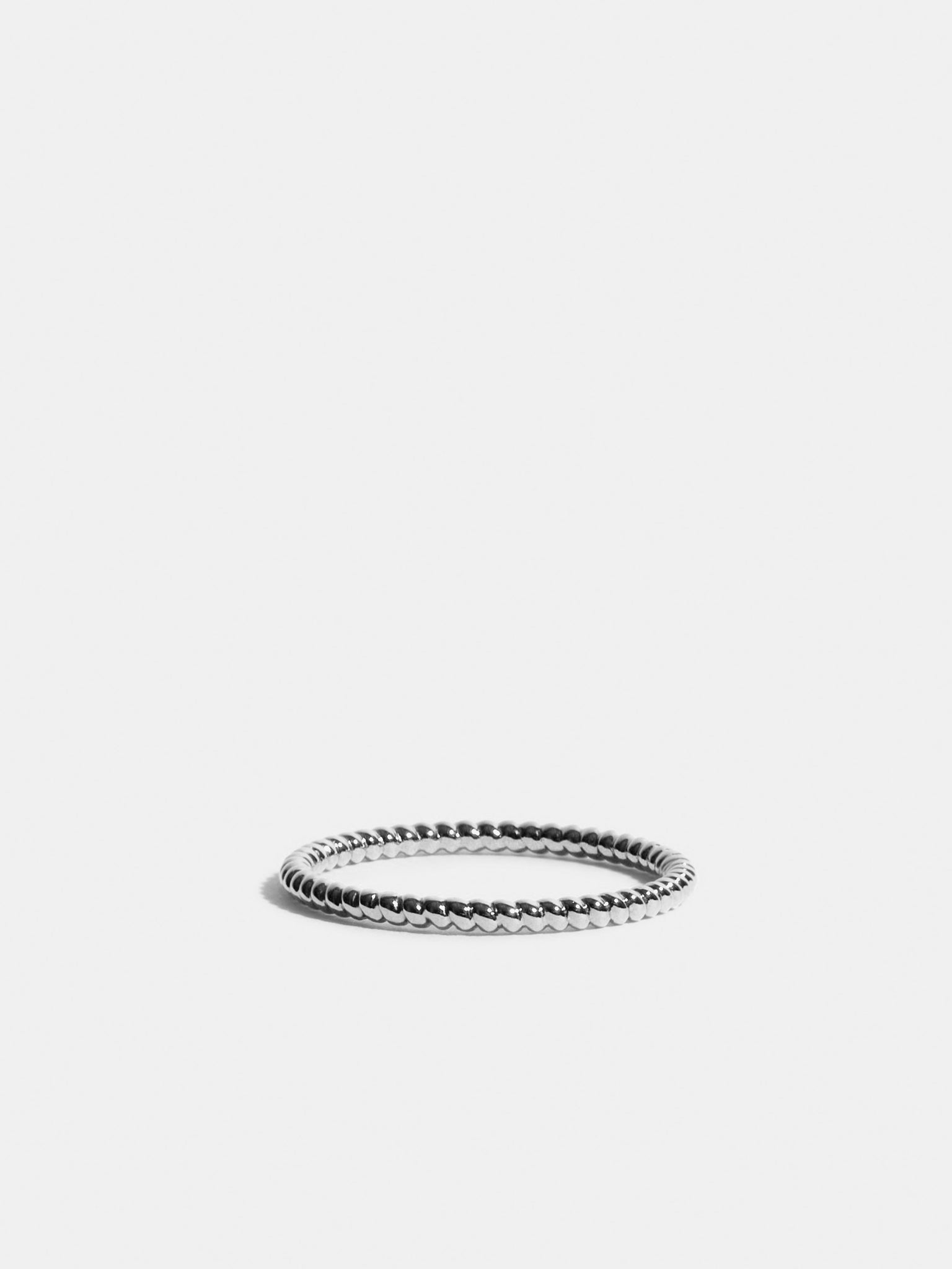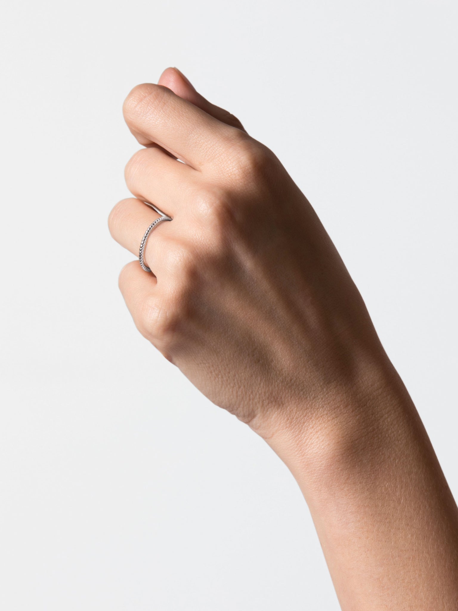 Bague Anagramme perlée en Or blanc 18 carats certifié Fairmined. Toutes les bagues de la collection Anagramme peuvent se porter seules, en accumulation avec d'autres anneaux Anagramme ou bien comme alliances.Archives JEM